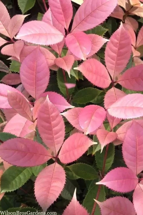 The most remarkable selection we’ve ever grown, the Noble Lady Tea Olive not only produces the heavenly fragrant flowers we love, it also has the showiest and largest leaves of any Osmanthus fragrans we’ve ever seen. New leaves emerge a deep pink in spring transitioning to lighter pink before turning to white and finally green. Flushes of new growth throughout the rest of the growing season will also be pink shades. The flowers are produced in fall, winter and early spring when daytime temperatures are ranging between 55 to 70 degrees F. This noble beauty serves well as a specimen shrub or as a hedge. As she grows taller, lower branches can be removed to form an outstanding evergreen tree perfect for use as a focal point in landscape borders or home foundation plantings. A stunning, sensory beauty that deserves a spot in every garden where it will grow (USDA Zones 7a-9b).